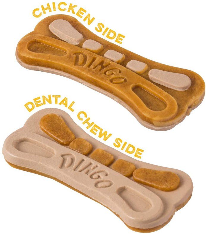 Dingo Delights 2-in-1 dog treats provide double the benefits of normal chews! Each bone-shaped treat features two sides: one is soft and chewy with real chicken flavor, and the other has a tough texture that helps clean teeth and remove tartar. And to top it off, Dingo Delights are 100% rawhide-free to aid digestion.