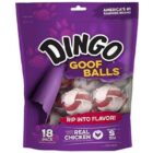 Dingo brands real meat and rawhide combinations deliver healthy and delicious chews to promote clean teeth (due to the natural action of chewing). These premium rawhide chews are available in a range of irresistibly tasty treats that dogs love. Dogs go goofy for fun and tasty Dingo Goof Balls. Premium rawhide and real chicken are woven together into a ball shape to create a fun and flavorful chew for small dogs.