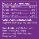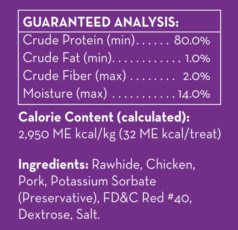 Ingredients: Rawhide, Chicken, Pork, Potassium Sorbate (preservative), FD and C Red 40, Dextrose, Salt.