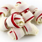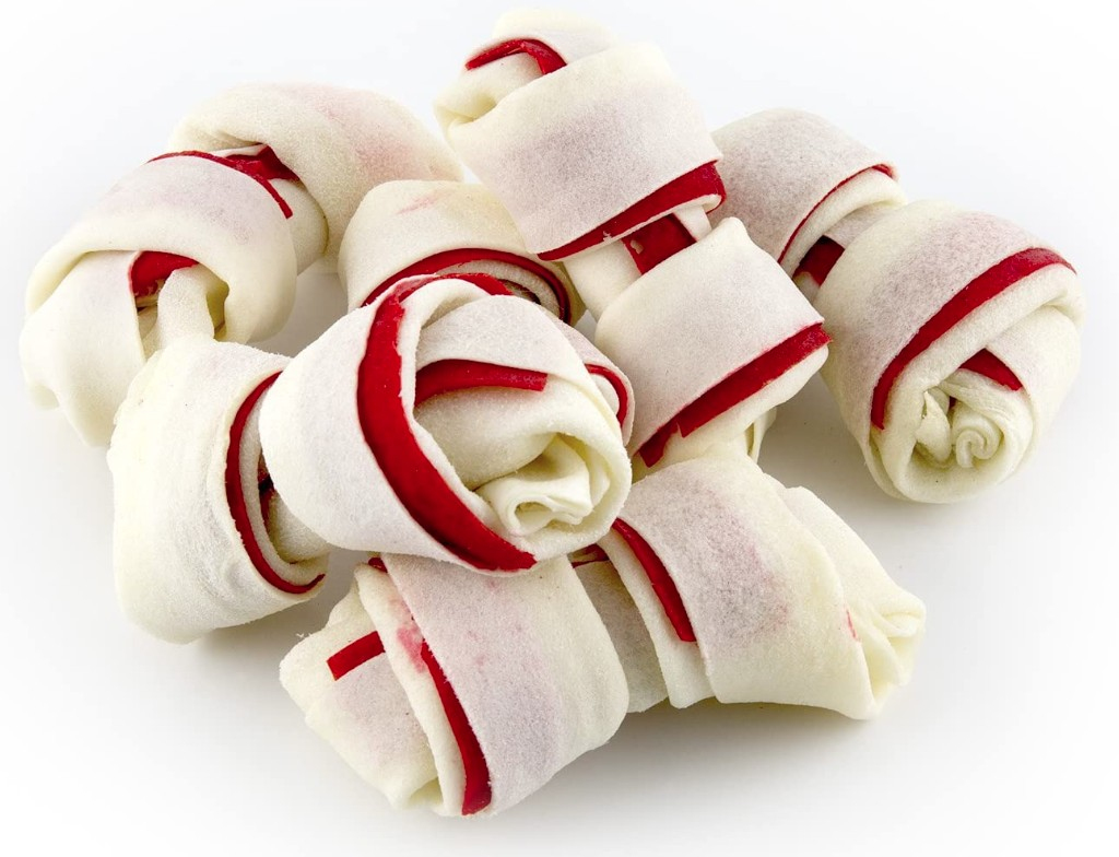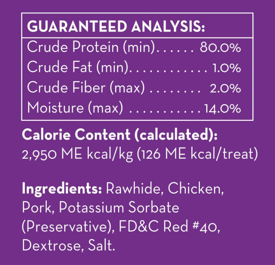 Ingredients: Rawhide, Chicken, Pork, Potassium Sorbate (preservative), FD and C Red 40, Dextrose, Salt.