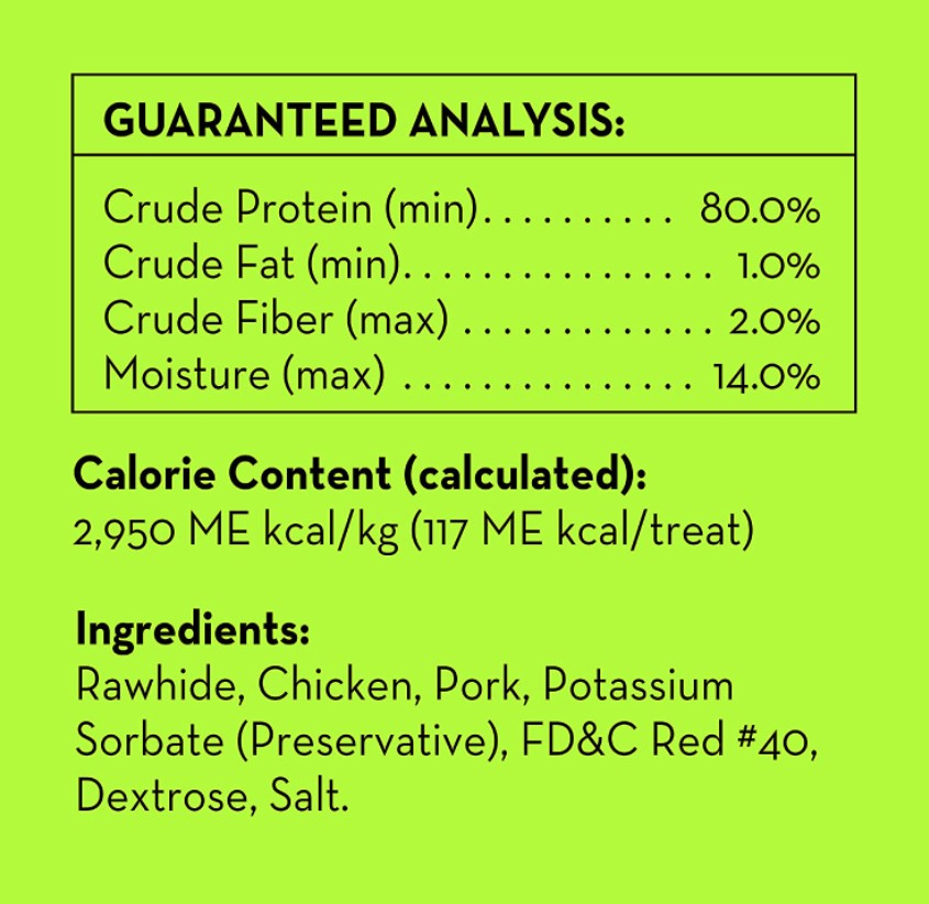 Ingredients: Rawhide, Chicken, Pork, Water, Dextrose, Potassium Sorbate (preservative), FD and C Red #40.