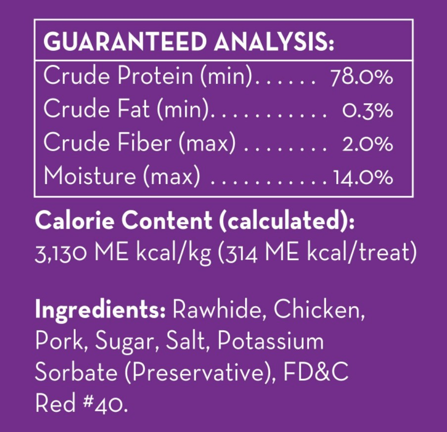 Ingredients: Rawhide, Chicken, Pork, Water, Dextrose, Salt, Potassium Sorbate (preservative), FD and C Red 40.