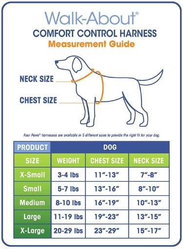 - X-Small: Dogs 3-4 lbs (11″-13″ Chest, 7″-8″ Neck)