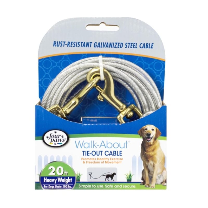 Four Paws Pet Select Walk-About Tie-Out Cable is Heavy Weight for Dogs up to 100 lbs. The Pet Select Tie Out Cable rust proof vinyl coated galvanized steel cable is durable for use outside for many years.