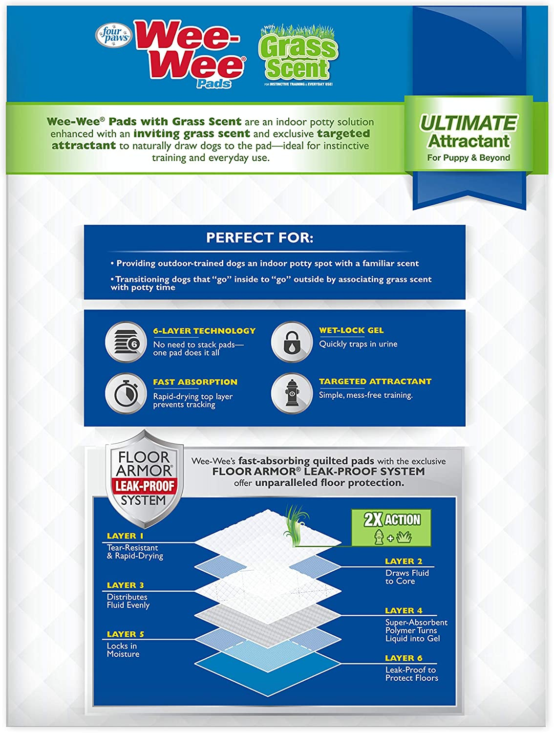 Wee-Wee Dog Pee Pads with Grass Scent is the perfect potty solution for instinctive training and everyday use. Offering 2X action, the pads are enhanced with an inviting grass scent and feature our exclusive targeted attractant that naturally draws dogs to the pad. No matter where your dog is trained to go potty, these dog training pads are the ideal solution. They provide outdoor-trained dogs an indoor potty spot with a familiar scent. Or, if you want to train your dog to go potty outside, the pads help make the transition by associating the smell of grass with potty time. Each pad is designed with a 6-layer Floor Armor Leak-Proof System, including a tear-resistant top layer, an absorbent polymer that turns liquid into gel, and a leak-proof bottom layer to keep floors dry for 24-hour protection guaranteed. Perfect for dogs of all sizes, these Wee-Wee Pads are 22 inches x 23 inches.