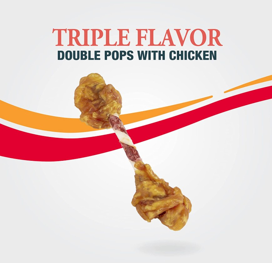 Good n Fun Double Pops with Chicken feature real chicken, beef hide and pork hide for a savory combination of flavors that dogs love. They are formulated to be a fun source of protein that satisfies the natural urge to chew while also helping to reduce tartar buildup with every bite.