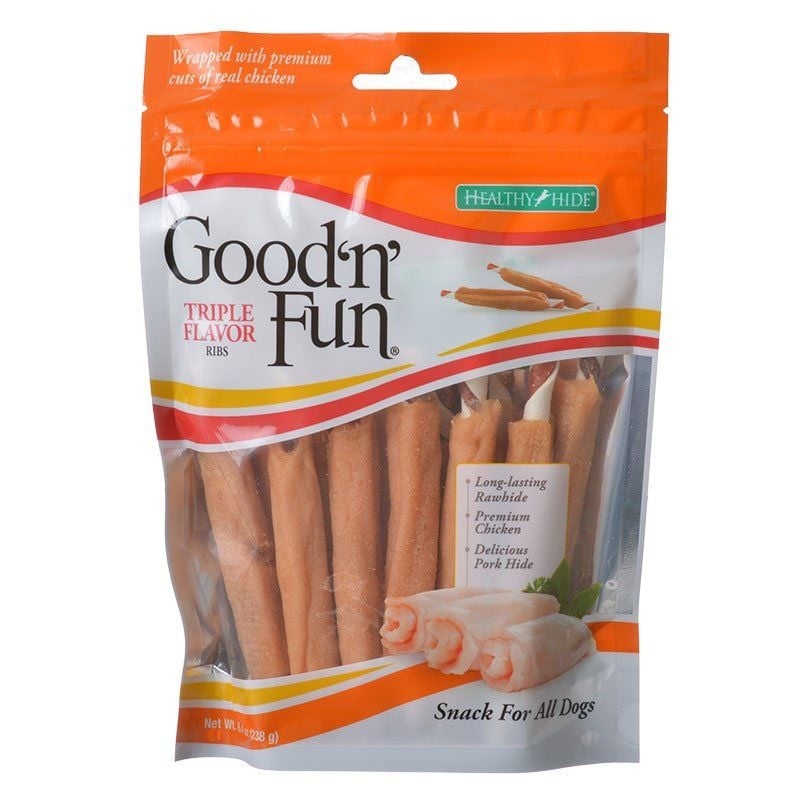 Healthy Hide Good ‘n’ Fun Triple-Flavor Ribs are crafted with natural rawhide and wrapped in a variety of real meats for a delectable flavor no dog can resist! These gourmet dog chews help reduce tartar buildup and promote better dental hygiene while satisfying your dogs urge to chew.