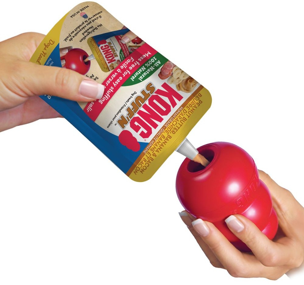 KONG StuffN All-Natural Peanut Butter, Bacon and Banana combines three favorite flavors in a convenient pouch designed with a mess-free nozzle for easy KONG stuffing. This irresistibly tasty, human grade treat is ideal for training and on-the-go uses. Extend the challenge and enrichment by placing a stuffed KONG in the freezer for 4-6 hours. No artificial colors, flavors. Gluten free. No refrigeration required. Made in the USA.