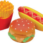 - Includes 3 Latex Dog Toys: Hamburger, Fries, and Hotdog