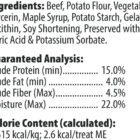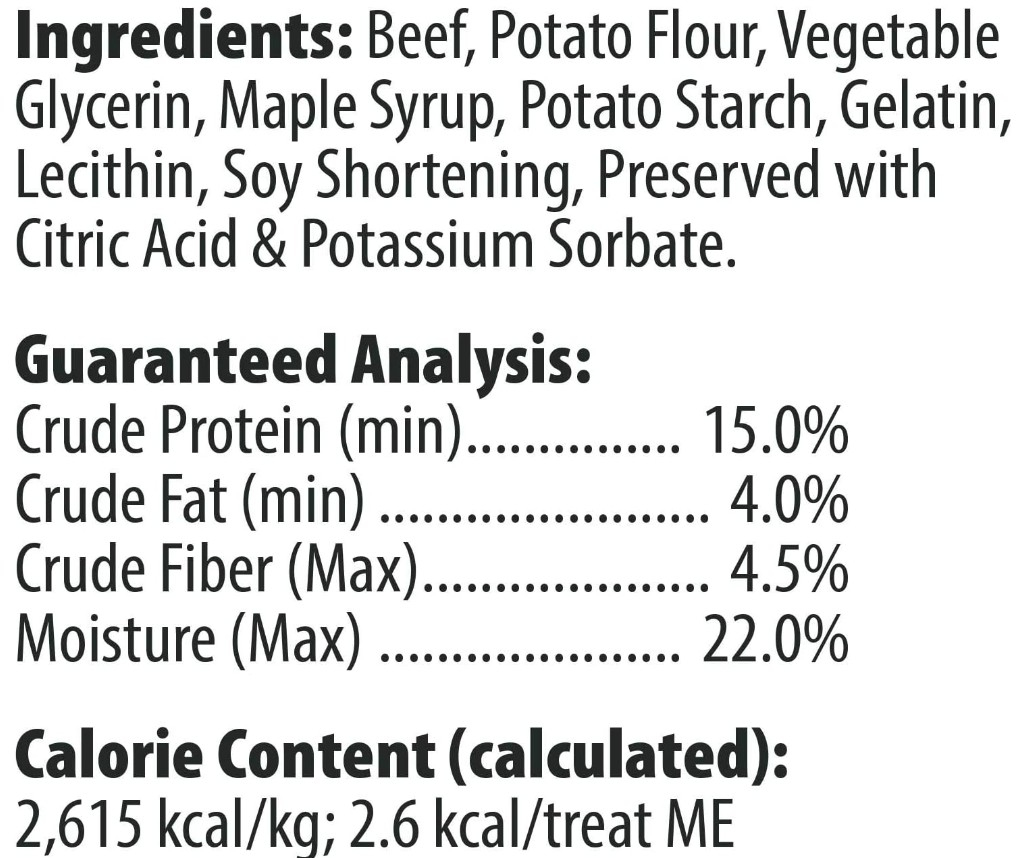 Ingredients: Beef, Potato Flour, Vegetable Glycerin, Maple Syrup, Potato Starch, Gelatin, Lecithin, Soy Shortening, preserved with Citric Acid and Potassium Sorbate.