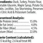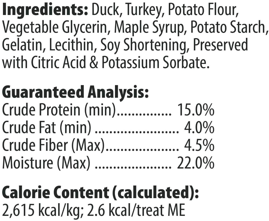 Ingredients: Duck, Turkey, Potato Flour, Vegetable Glycerin, Maple Syrup, Potato Starch, Gelatin, Lecithin, Soy Shortening, preserved with Citric Acid and Potassium Sorbate.