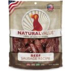 Natural Value Beef Sausages are all natural, meaty dog treats, 100% farmed and made in the USA. These tasty beef chews are cooked on open grilling racks to reduce fat and enhance flavor, and contain no wheat, corn, soy, gluten, grain, or by-products.