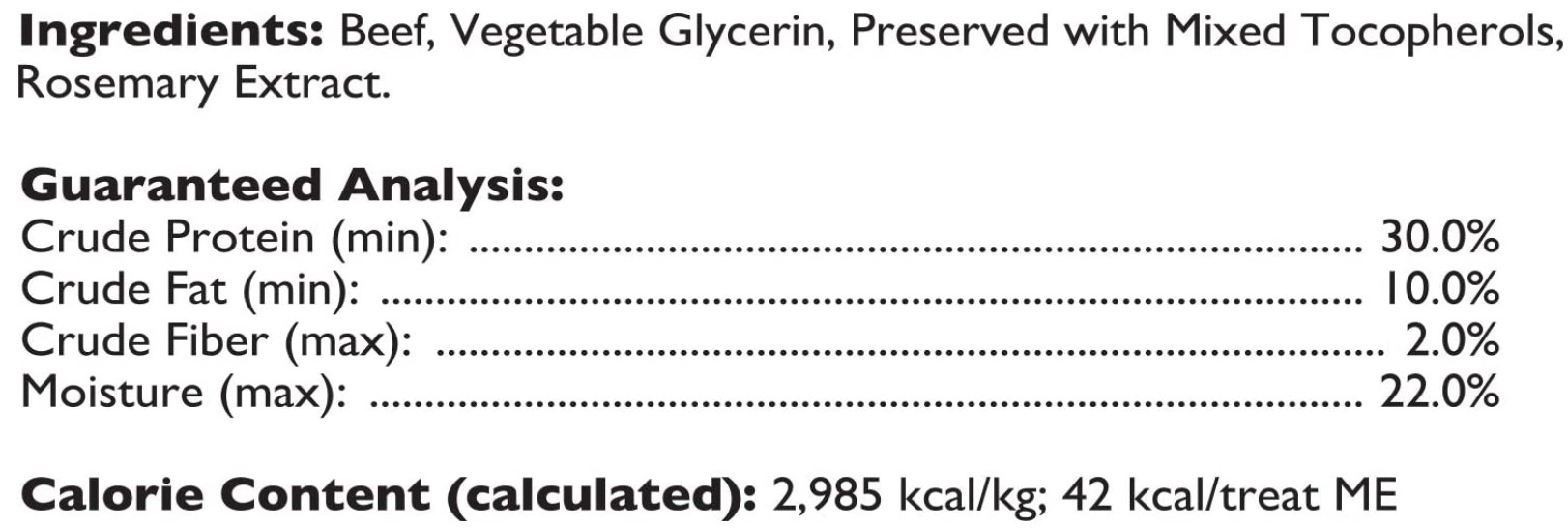 Ingredients: Beef, Potato Flour, Vegetable Glycerin, Mixed Tocopherols (preservative), Rosemary Extract.