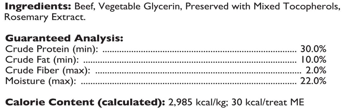 Ingredients: Beef, Vegetable Glycerin, Mixed Tocopherols (preservative), Rosemary Extract.