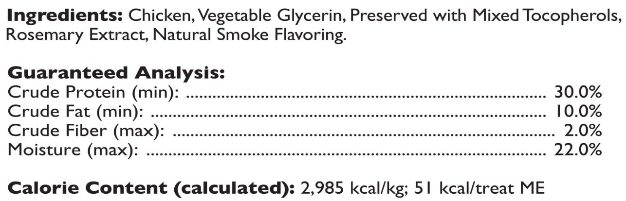 Ingredients: Chicken, Potato, Vegetable Glycerin, Mixed Tocopherols (preservative), Rosemary Extract.