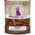 Natural Value Duck Sausages are all natural, meaty dog treats, 100% farmed and made in the USA. These tasty duck chews are cooked on open grilling racks to reduce fat and enhance flavor, and contain no wheat, corn, soy, gluten, or by-products.