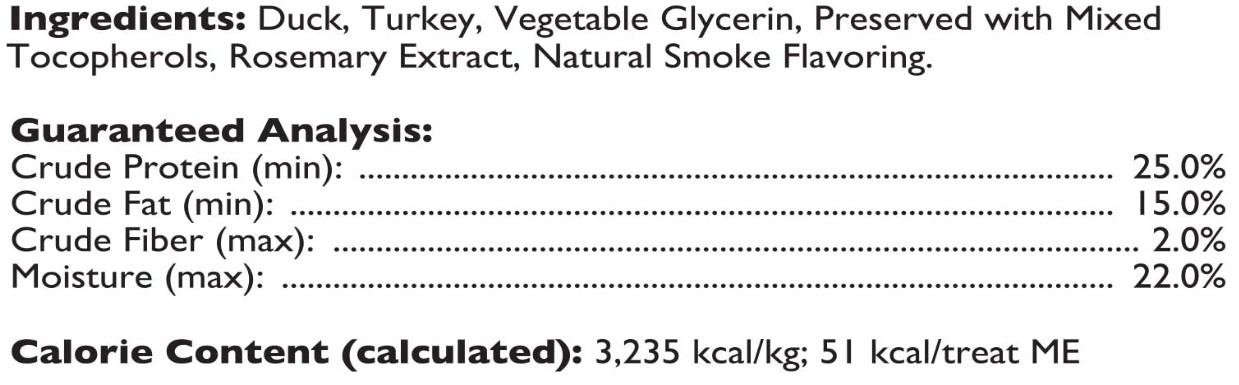 Ingredients: Duck, Turkey, Tapioca, Brown Rice Flour, Vegetable Glycerin, Mixed Tocopherols (preservative), Rosemary Extract.