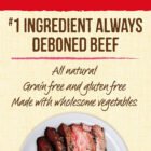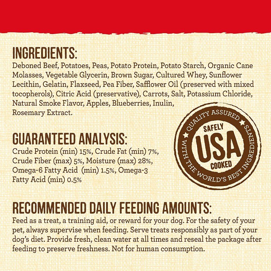 Ingredients: Deboned Beef, Potatoes, Peas, Potato Protein, Potato Starch, Organic Cane Molasses, Vegetable Glycerin, Brown Sugar, Cultured Whey, Sunflower Lecithin, Gelatin, Flaxseed, Pea Fiber, Safflower Oil (preserved with mixed tocopherols), Citric Acid (preservative), Carrots, Salt, Potassium Chloride, Natural Smoke Flavor, Apples, Blueberries, Inulin, Rosemary Extract.