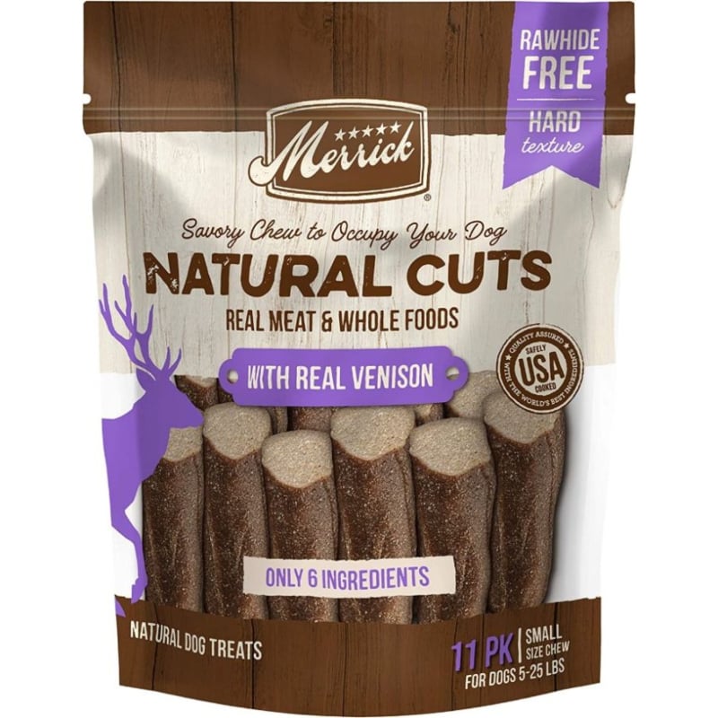 Merrick Natural Cuts are a NEW, rawhide free dog treat designed to occupy your dog with no staining, splintering, or plastic. Made with natural ingredients like real venison and whole foods, these savory dog chews contain only 6 simple ingredients with an irresistible meaty smell your dog will crave.