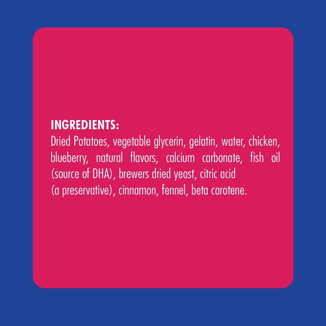 Dried Potatoes, Vegetable Glycerin, Gelatin, Water, Chicken, Blueberry, Natural Flavors, Calcium Carbonate, Fish Oil (Source Of DHA), Brewers Dried Yeast, Citric Acid (A Preservative), Cinnamon, Fennel, Beta Carotene, Red 40.