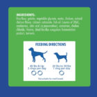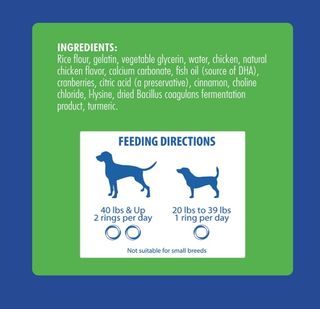 Ingredients: Rice flour, gelatin, vegetable glycerin, water, chicken, natural chicken flavor, calcium carbonate, fish oil (source of DHA), cranberries, citric acid (a preservative), cinnamon, choline chloride, l-lysine, dried Bacillus coagulans fermentation product, turmeric.
