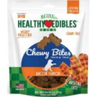 Nylabone Natural Healthy Edibles Bacon Chewy Bites Dog Treats are natural dog treats made with real meat and no grain or artificial preservatives. Featuring savory bacon flavor your four-legged friend craves, our soft and chewy snacks for dogs make perfect treats for training and rewarding. These loving treats are also highly digestible and help support your dogs digestive system to promote overall health. Created with care, these meat dog treats are perfect for dogs of all sizes and proudly made in the USA!