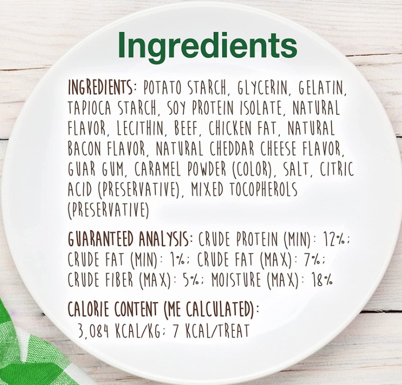INGREDIENTS: Potato Starch, Vegetable Glycerin, Tapioca Starch, Gelatin, Soy Protein Isolate, Natural Flavor, Lecithin, Beef, Chicken Fat, Natural Bacon Flavor, Natural Cheddar Cheese Flavor, Guar Gum, Caramel Powder (Color), Salt, Citric Acid, Mixed Tocopherols