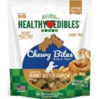 Nylabone Natural Healthy Edibles Peanut Butter Chewy Bites Dog Treats are grain-free, natural dog treats with no artificial preservatives. Featuring nutty allergen-free peanut butter flavor your four-legged friend loves, these soft and chewy snacks for dogs make perfect treats for training and rewarding. These loving treats are also highly digestible and help support your dogs digestive system to promote overall health. Created with care, these wholesome dog treats are perfect for dogs of all sizes and proudly made in the USA!
