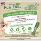 Cleaning your dogs teeth takes commitment. Why not let him help Nutri Dent Limited Ingredients Dental Chew Treats naturally freshen your dogs breath and clean his teeth with 360-degree scrubbing nubs and only 8 simple ingredients. They are easy to digest, promote your dogs well-being with natural ingredients, and contain no artificial colors, flavors, or preservatives. They clean like a brush and taste like a treat!
