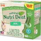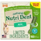 Cleaning your dogs teeth takes commitment. Why not let him help Nutri Dent Limited Ingredients Dental Chew Treats naturally freshen your dogs breath and clean his teeth with 360-degree scrubbing nubs and only 8 simple ingredients. They are easy to digest, promote your dogs well-being with natural ingredients, and contain no artificial colors, flavors, or preservatives. They clean like a brush and taste like a treat!
