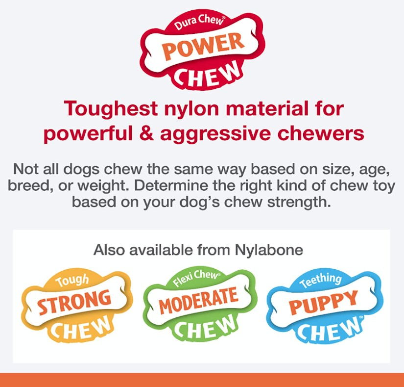 Powerful dogs wish for tough chew toys! Made with tough, durable nylon and a textured surface for extra chewing fun, the Nylabone Power Chew Dura Chew Knot Bone Large Chew Toy is the long lasting chew toy you need for your aggressive chewer. This extra large dog chew keeps dogs busy, satisfies their natural urge to chew, and encourages positive chewing habits. Plus, the bristles raised during chewing promote clean teeth and help control plaque and tartar.