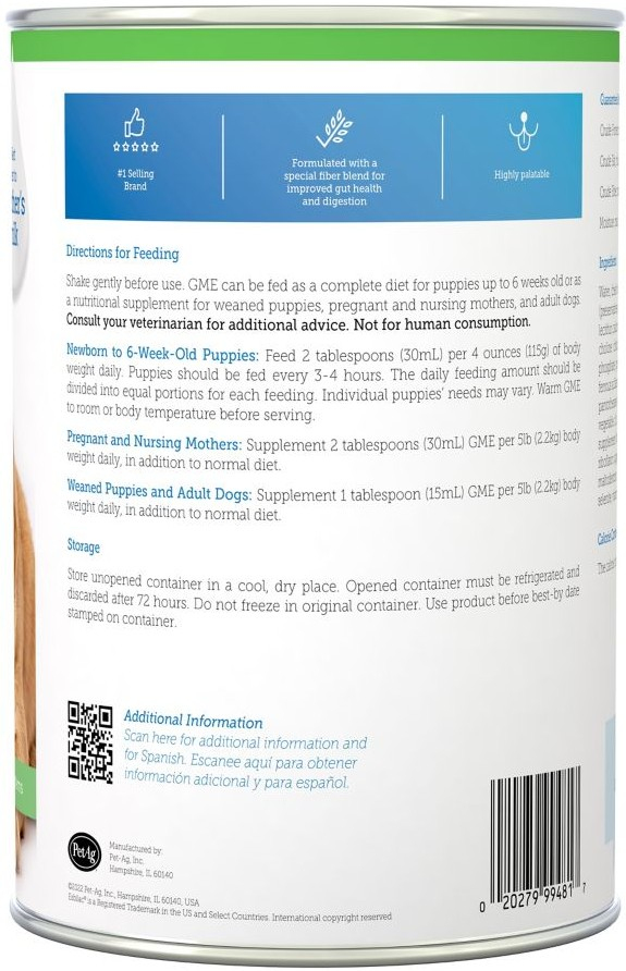 PetAg Goats Milk Esbilac Liquid Puppy Supplement is designed to aid those puppies who have sensitive digestive systems. Transitioning from moms milk to regular food can be tough for some puppies and unfortunately, it sometimes has to happen sooner than wed like which is why PetAg Goats Milk Esbilac Liquid Puppy Supplement is formulated with whole goats milk protein to closely match moms milk in terms of protein, fat, and carbohydrates, making it easy for your new canine companion to digest. With added vitamins, minerals, and essential amino acids, this dietary supplement also works to promote nutrient absorption to help ensure that your little guy grows up to be a happy and healthy member of your family.