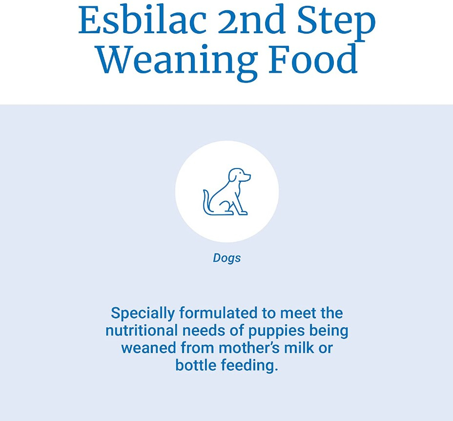 Pet Ag Weaning Formula Puppy is a highly digestible complete food for young growing puppies. Esbilac 2nd Step Puppy Weaning Food is a creamy transitional cereal developed to follow Esbilac, for easy transition from milk to solid food.