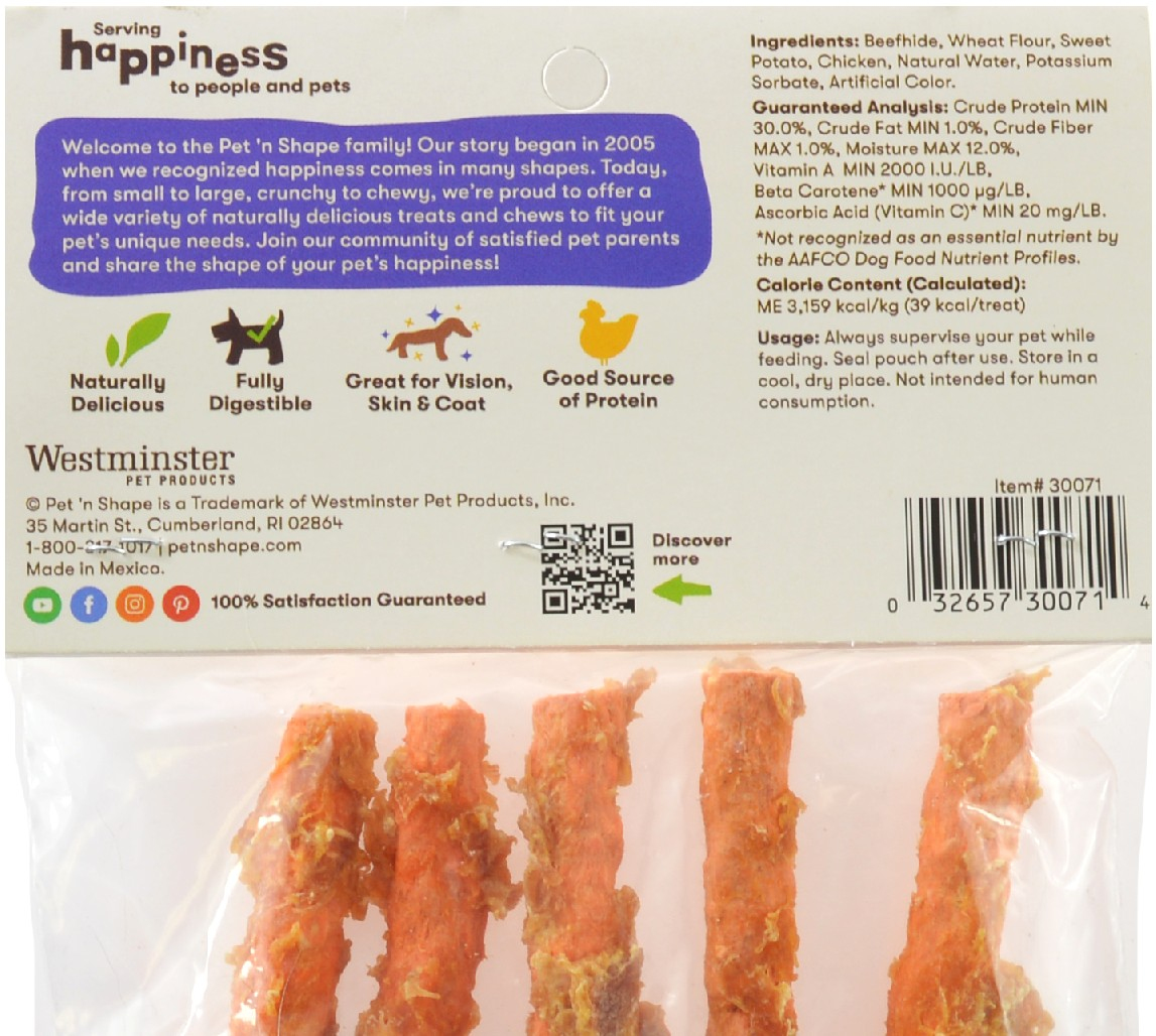 Pups go wild for Pet ‘n Shape sweet potato treats. Made from naturally delicious sweet potatoes, these treats are a tasty alternative for dogs with sensitive stomachs and allergies.