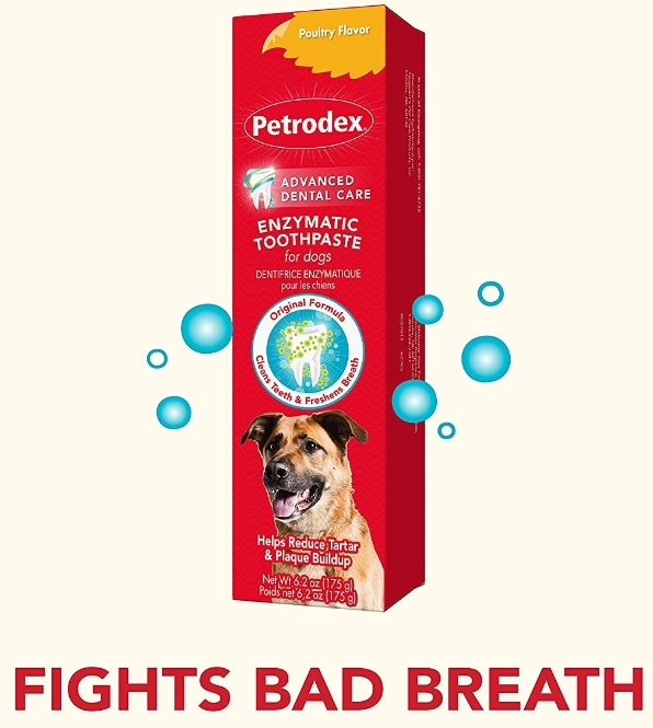 Petrodex Enzymatic Pet Toothpaste is formulated specifically to help control plaque and fight bad breath for dogs. It does not foam and doesn’t need to be rinsed! With the delicious poultry flavor, your dog will love getting his teeth brushed.