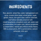 Ingredients: Rice, glycerin, wheat flour, water, hydrogenated corn syrup, brewers dried yeast, wheat gluten, sugar, gelatin, bacon, corn germ meal, sodium caseinate, beef tallow preserved with mixed tocopherols, phosphoric acid, salt, sorbic acid (a preservative), calcium propionate (a preservative), ironoxide color, natural smoke flavor, BHA (a preservative), BHT (a preservative), calcium carbonate, citricacid.
