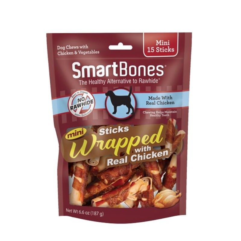 SmartBones Mini Chicken-Wrapped Sticks for dogs are made with real chicken and wholesome vegetables. They have a delectable chicken layer wrapped around the outside for a scrumptious taste dogs can’t resist. These chews are enriched with vitamins and minerals and are perfectly sized for your dog. They’ll love the vegetable outside and delicious chicken inside and outside.