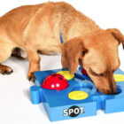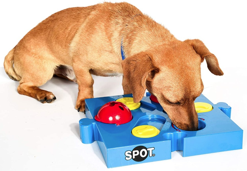 Provide your dog with brain stimulation while treating them with yummy pet treats Whether you’re a dog owner, a pet sitter, or a dog lover, its important to keep your fluffy friends happy, excited, and stimulated. This dog food dispenser toy will do just that. A bright and cheerful bonding experience that enhances your pets IQ We created SPOT Flip N’ Slide treat dispenser to provide your pup with enrichment, brain stimulation, and loads of fun. Designed with your dogs favorite colors blue, yellow, and red we are sure your best friend will thoroughly enjoy this puzzle feeder and will enhance his treat-time experience.