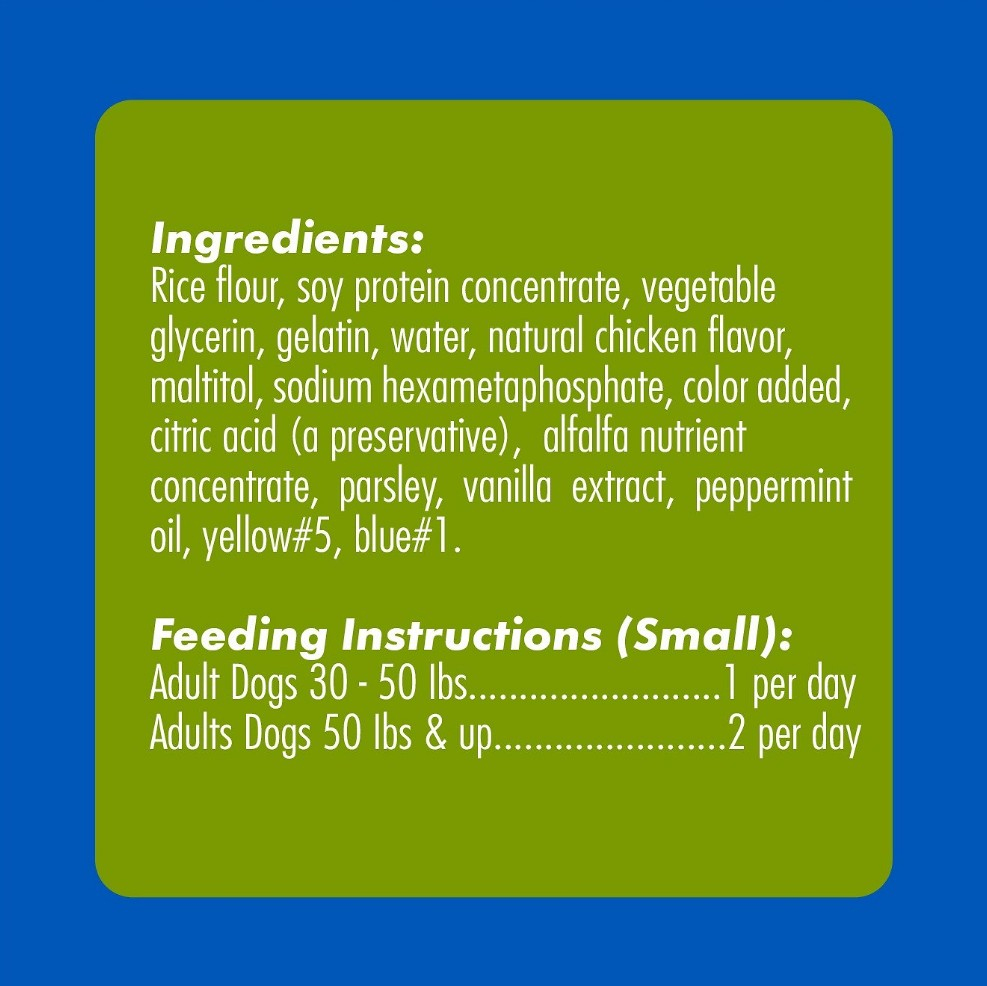 Ingredients: Rice Flour, Soy Protein Concentrate, Vegetable Glycerin, Gelatin, Water, Natural Chicken Flavor, Alfalfa, Sodium Hexametaphosphate, Citric Acid (a preservative), Peppermint, Parsley, Vanilla.